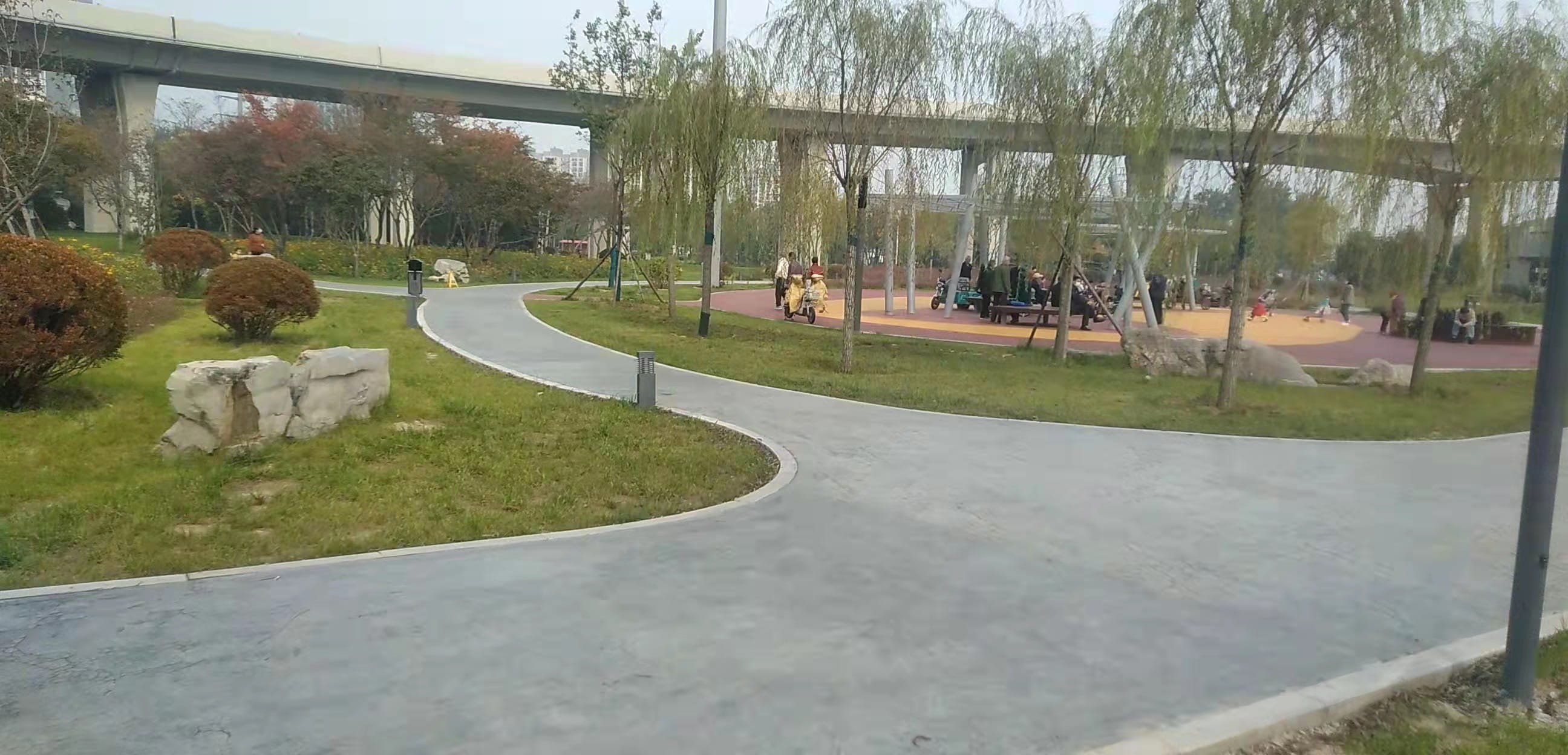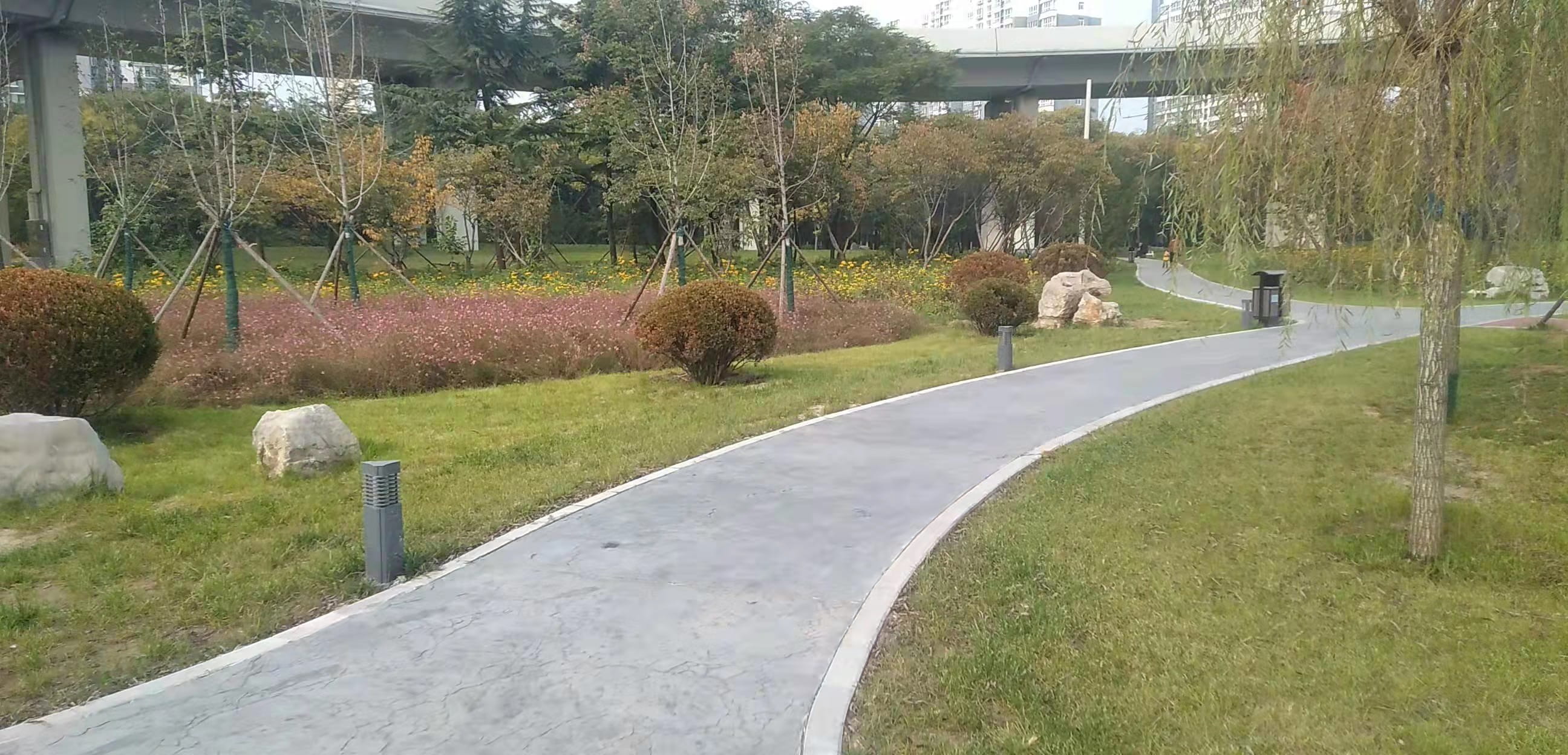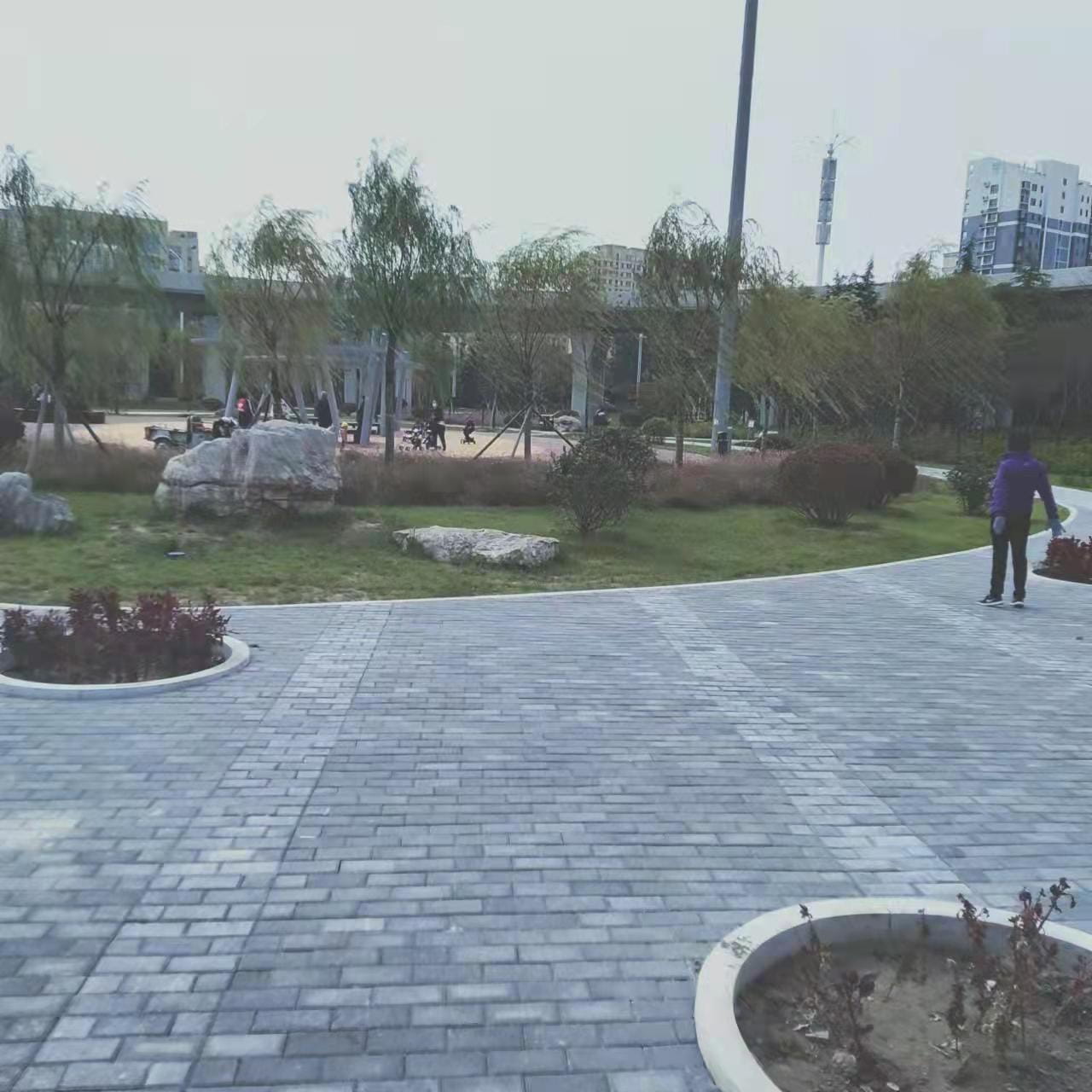 已完成的施工內(nèi)容:種植土回填約60000方,栽植喬木550株、灌木650株,綠籬42000平方、草坪18500平方,花卉播種約30000平方,澆灌管道5600米,路牙石安裝2700米,塑膠場地700平方,新增彩色混凝土廣場面層770平方,透水磚廣場 200平方,景石450噸, 快速取水閥190套,景亭1組等。