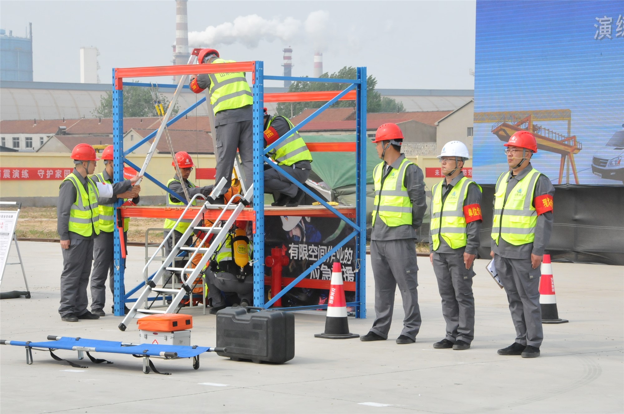 此次演練模擬背景為綠達公司濱海瀝青拌合廠職工在進入瀝青罐檢修時昏迷,現場負責人迅速向上級匯報并展開救援。